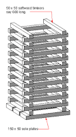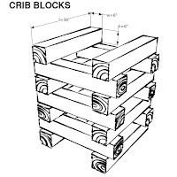 A chock (cog or crib) is a stacked wooden support made of sleepers arranged in a crisscross pattern. It covers a larger area than props and is used where: