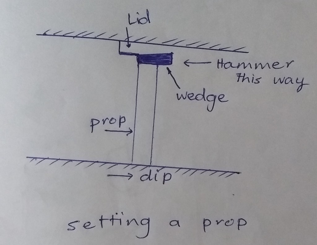 • Plumb Bob Method: A plumb bob is used to align the prop with the roof. Timber helpers hold the prop while a worker places the lid and wedges.